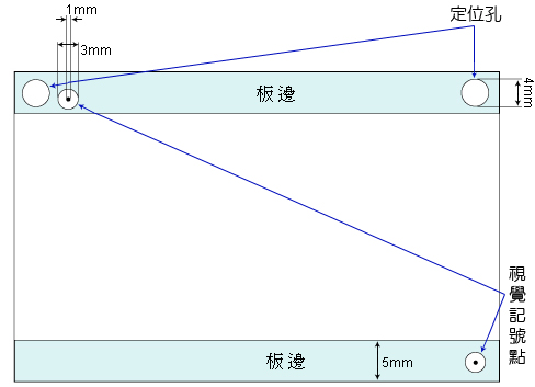 4. 標準定位孔規格:同一板邊左右各一定位孔,圓心各離兩邊板緣 5mm 的直徑、4mm 圓孔。 |